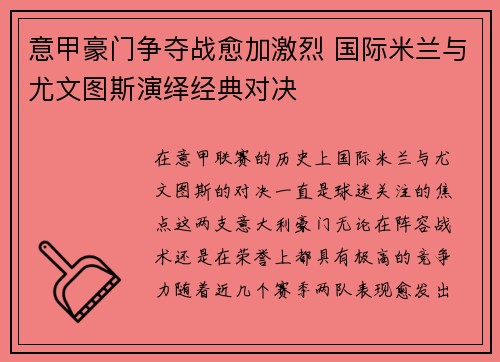 在意甲联赛的历史上,国际米兰与尤文图斯的对决一直是球迷关注的焦点。这两支意大利豪门,无论在阵容、战术,还是在荣誉上都具有极高的竞争力。随着近几个赛季两队表现愈发出色,意甲豪门之间的争夺战愈加激烈,而国...